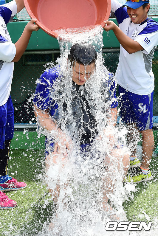 21일 오후 대구 시민구장에서 삼성 라이온즈와 두산 베어스의 경기가 열릴 예정인 가운데 삼성 최형우가 그라운드 위에서 아이스버킷챌린지를 하고 있다.