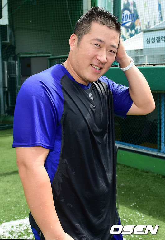 21일 오후 대구 시민구장에서 삼성 라이온즈와 두산 베어스의 경기가 열릴 예정인 가운데 삼성 최형우가 그라운드 위에서 아이스버킷챌린지를 마친 후 최형우가 취재진에게 다음 아이스버킷챌린지를 지목하고 있다.