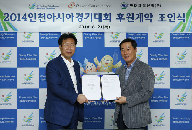 2014 인천아시아경기대회 조직위원회(위원장 김영수)는 21일 송도 미추홀타워 조직위 회의실에서 현대체육산업과 인천아시안게임 체조 및 레슬링 경기용 기구 부문 공식 후원계약 체결 조인식을 가졌다.