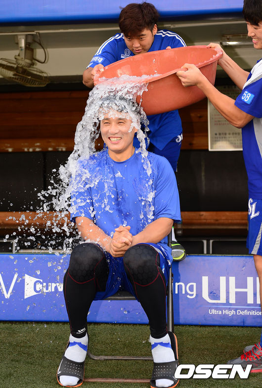 21일 오후 대구 시민구장에서 삼성 라이온즈와 두산 베어스의 경기가 열릴 예정인 가운데 삼성 이승엽이 그라운드 위에서 아이스버킷챌린지를 하고 있다.