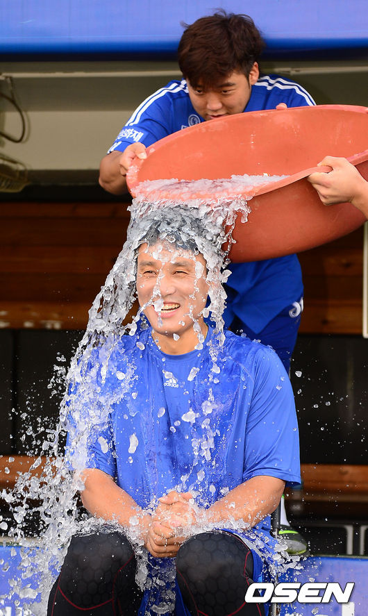 21일 오후 대구 시민구장에서 삼성 라이온즈와 두산 베어스의 경기가 열릴 예정인 가운데 삼성 이승엽이 그라운드 위에서 아이스버킷챌린지를 하고 있다.