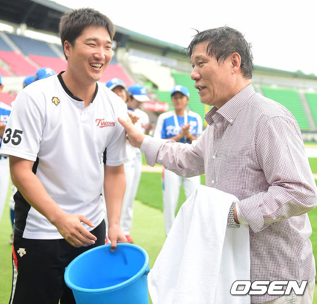 21일 오후 서울 잠실야구장에서 LG 트윈스와 KIA 타이거즈의 경기가 열릴 예정인 가운데 허구연 해설위원이 그라운드 위에서 아이스버킷챌린지를 마치고 LG 이진영과 인사를 나누고 있다.