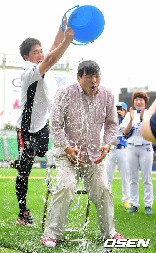 21일 오후 서울 잠실야구장에서 LG 트윈스와 KIA 타이거즈의 경기가 열릴 예정인 가운데 허구연 해설위원이 그라운드 위에서 아이스버킷챌린지를 하고 있다.