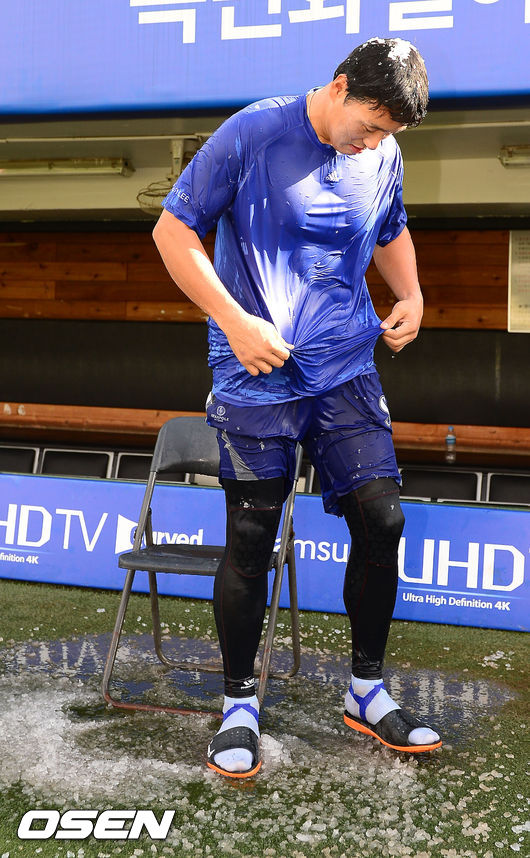 21일 오후 대구 시민구장에서 삼성 라이온즈와 두산 베어스의 경기가 열릴 예정인 가운데 삼성 이승엽이 그라운드 위에서 아이스버킷챌린지를 마친 후 퇴장하고 있다.