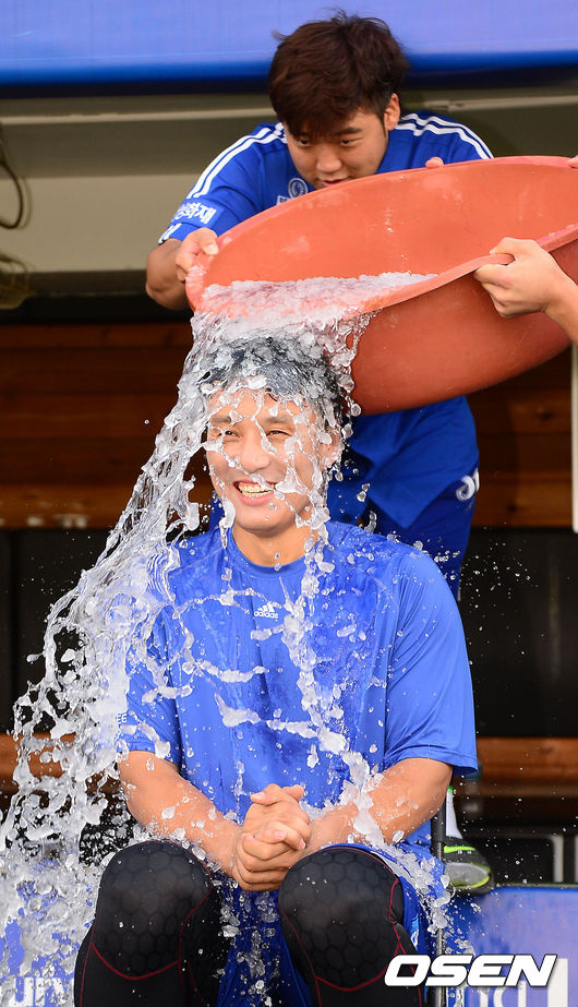 21일 오후 대구 시민구장에서 삼성 라이온즈와 두산 베어스의 경기가 열릴 예정인 가운데 삼성 이승엽이 그라운드 위에서 아이스버킷챌린지를 하고 있다.