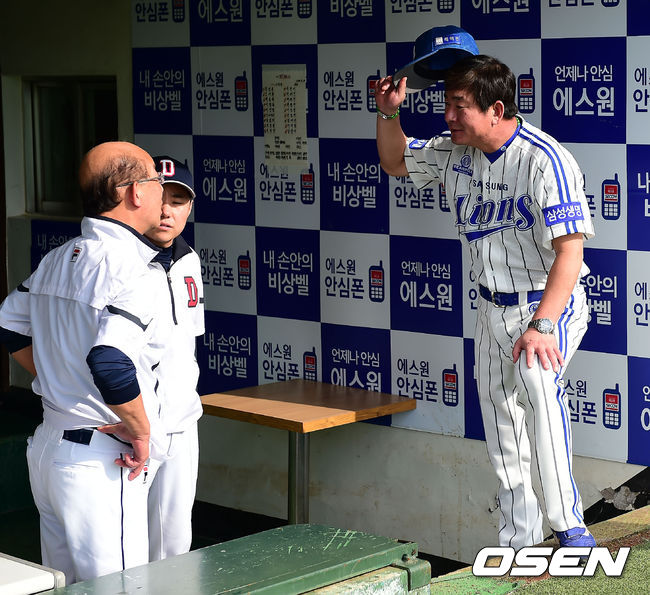 21일 오후 대구 시민구장에서 삼성 라이온즈와 두산 베어스의 경기가 열릴 예정인 가운데 삼성 류중일 감독과 두산 송일수 감독이 얘기를 나누고 있다.