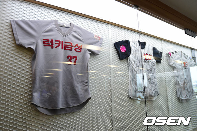 사진은 LG 트윈스 사료실에 전시된 역대 유니폼의 모습.