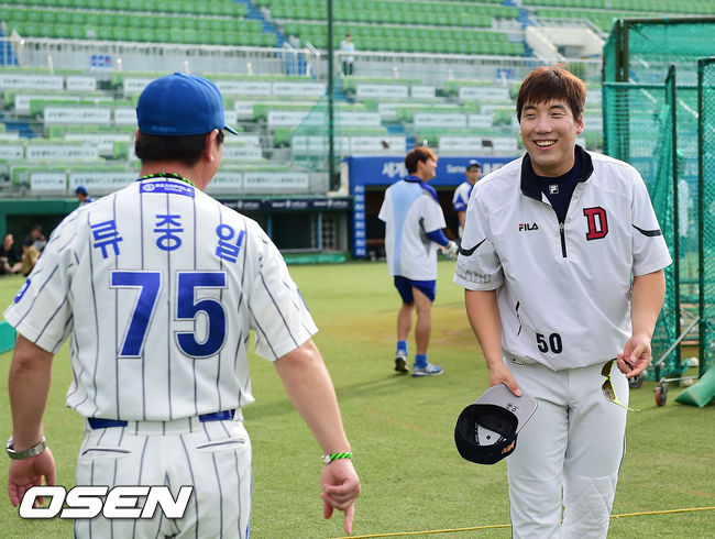 21일 오후 대구 시민구장에서 삼성 라이온즈와 두산 베어스의 경기가 열릴 예정인 가운데 삼성 류중일 감독과 두산 김현수가 즐겁게 얘기를 나누고 있다.