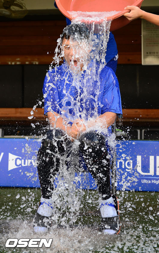 21일 오후 대구 시민구장에서 삼성 라이온즈와 두산 베어스의 경기가 열릴 예정인 가운데 삼성 이승엽이 그라운드 위에서 아이스버킷챌린지를 하고 있다.