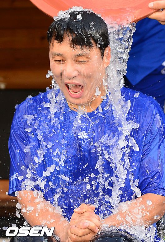 21일 오후 대구 시민구장에서 삼성 라이온즈와 두산 베어스의 경기가 열릴 예정인 가운데 삼성 이승엽이 그라운드 위에서 아이스버킷챌린지를 하고 있다.