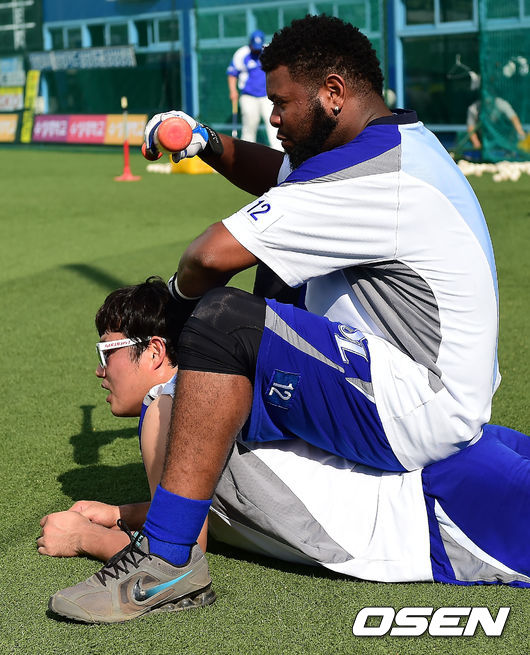 21일 오후 대구 시민구장에서 삼성 라이온즈와 두산 베어스의 경기가 열릴 예정인 가운데 경기 전 삼성 나바로가 이지영이 위에 올라타 말타는 흉내를 내고 있다.
