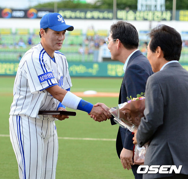 21일 오후 대구 시민구장에서 삼성 라이온즈와 두산 베어스의 경기가 열릴 예정인 가운데 삼성 이승엽이 검찰청 홍보대사에 위촉되고 있다.