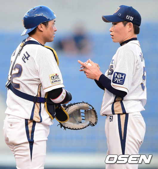21일 오후 경남 창원 마산구장에서 열린 '2014 한국야쿠르트 세븐 프로야구' NC 다이노스와 넥센 히어로즈의 경기 1회초 2사 1,2루 김민성 타석, 이재학과 김태군이 마운드에서 이야기를 나누고 있다.