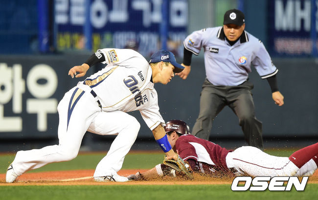 21일 오후 경남 창원 마산구장에서 열린 '2014 한국야쿠르트 세븐 프로야구' NC 다이노스와 넥센 히어로즈의 경기 3회초 1사 2루 유한준 타석, 2루주자 서건창이 도루에 실패하고 있다.
