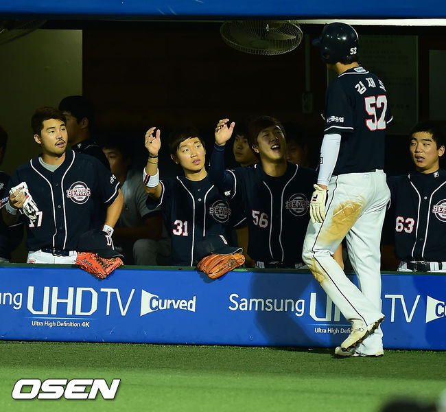 21일 오후 대구 시민구장에서 열린 삼성 라이온즈와 두산 베어스의 경기, 3회초 1사 주자 2,3루 두산 김현수가 2루수 땅볼 타구를 날렸을 때 홈을 밟은 김재호가 덕아웃에서 동료들과 하이파이브를 하고 있다.