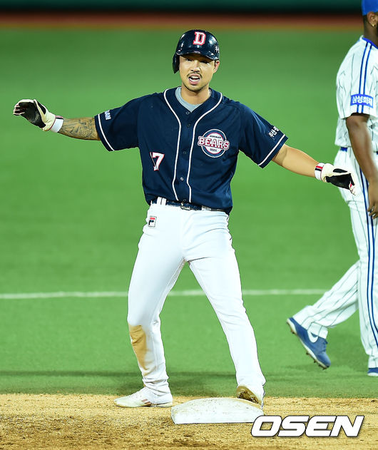 21일 오후 대구 시민구장에서 열린 삼성 라이온즈와 두산 베어스의 경기, 4회초 1사 주자 1루 두산 최주환 타석에서 1루 주자 오재원이 2루 도루를 시도하였으나 삼성 유격수 김상수에게 태그아웃을 당한 후 아쉬워하고 있다.