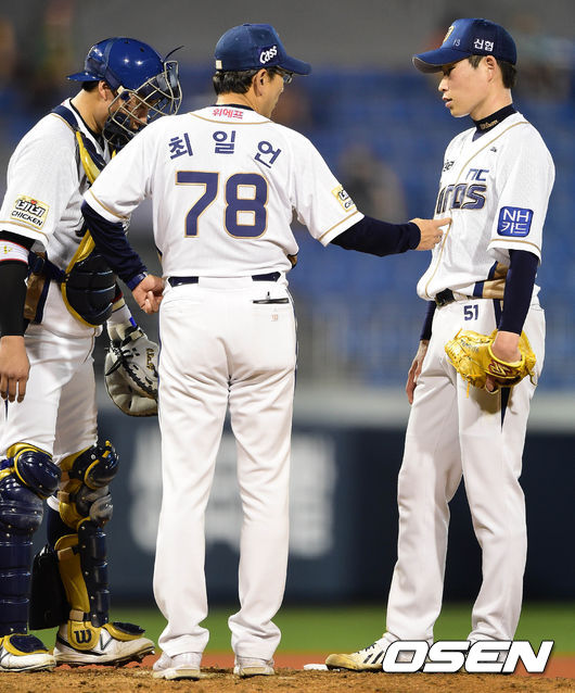 21일 오후 경남 창원 마산구장에서 열린 '2014 한국야쿠르트 세븐 프로야구' NC 다이노스와 넥센 히어로즈의 경기 5회초 2사 1,2루 강정호 타석, 이재학이 최일언 코치의 이야기를 듣고 있다.
