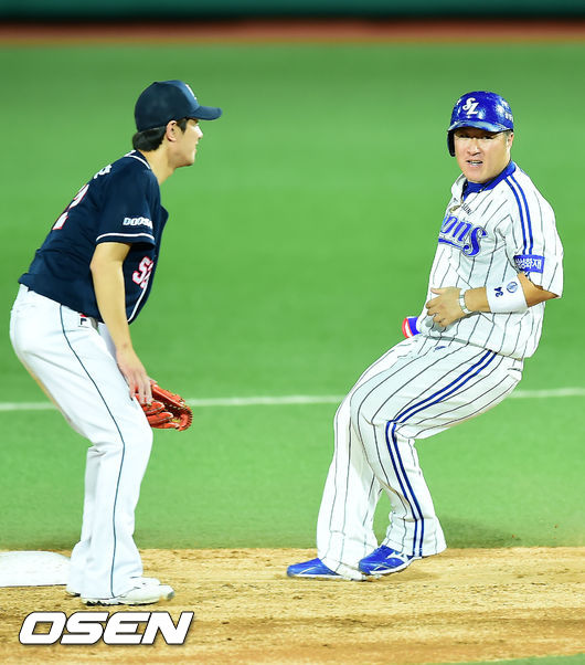 21일 오후 대구 시민구장에서 열린 삼성 라이온즈와 두산 베어스의 경기, 4회말 2사 주자 1루 삼성 박해민의 타석에서 1루 주자 최형우가 무관심 도루에 성공하고 있다.
