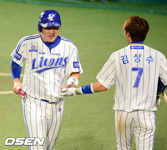 21일 오후 대구 시민구장에서 열린 삼성 라이온즈와 두산 베어스의 경기, 4회말 2사 주자 2루 삼성 박해민의 역전 1타점 적시타때 홈을 밟은 최형우가 덕아웃 앞에서 김상수와 하이파이브를 하고 있다.
