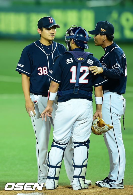 21일 오후 대구 시민구장에서 열린 삼성 라이온즈와 두산 베어스의 경기, 4회말 무사 주자 1루 삼성 최형우에게 중견수 왼쪽 안타를 맞은 두산 선발 노경은이 이광우 투수 코치와 얘기를 나누고 있다.