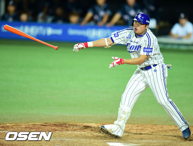 21일 오후 대구 시민구장에서 열린 삼성 라이온즈와 두산 베어스의 경기, 5회말 1사 주자 1루 삼성 박한이가 타석에서 스윙을 하며 배트를 던지고 있다.
