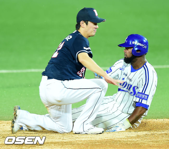 21일 오후 대구 시민구장에서 열린 삼성 라이온즈와 두산 베어스의 경기, 5회말 1사 주자 1루 삼성 박한이가 타석에서 1루 주자 나바로가 2루 도루를 시도했으나 두산 유격수 김재호에게 태그아웃을 당하고 있다.