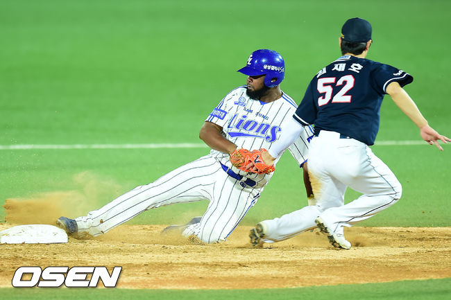 21일 오후 대구 시민구장에서 열린 삼성 라이온즈와 두산 베어스의 경기, 5회말 1사 주자 1루 삼성 박한이가 타석에서 1루 주자 나바로가 2루 도루를 시도했으나 두산 유격수 김재호에게 태그아웃을 당하고 있다.