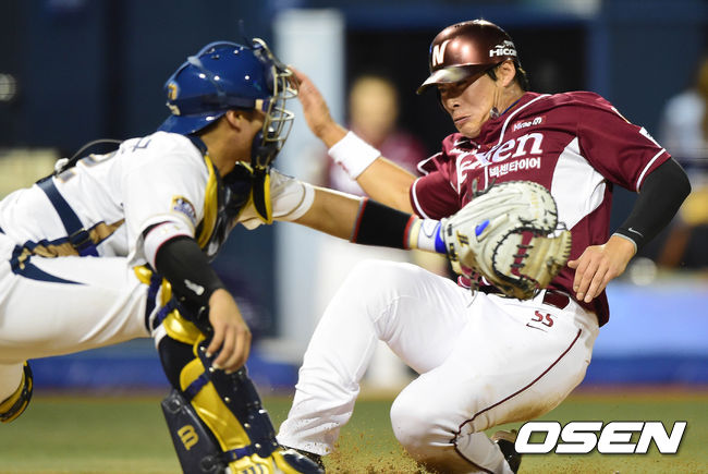 21일 오후 경남 창원 마산구장에서 열린 '2014 한국야쿠르트 세븐 프로야구' NC 다이노스와 넥센 히어로즈의 경기 6회초 1사 만루 이택근의 내야땅볼 상황, 3루주자 안태영이 홈에서 포스아웃 당하고 있다.