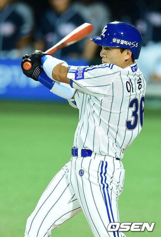 21일 오후 대구 시민구장에서 열린 삼성 라이온즈와 두산 베어스의 경기, 6회말 1사 주자 1루 삼성 이승엽이 우익수 앞 안타를 날리고 있다.