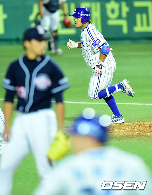 21일 오후 대구 시민구장에서 열린 삼성 라이온즈와 두산 베어스의 경기, 6회말 1사 주자 1,3루 삼성 박석민이 좌월 스리런 홈런을 날린 후 그라운드를 돌고 있다.