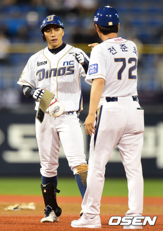 21일 오후 경남 창원 마산구장에서 열린 '2014 한국야쿠르트 세븐 프로야구' NC 다이노스와 넥센 히어로즈의 경기 6회말 2사 2,3루 이종욱이 2타점 2루타를 치고 전준호 코치와 하이파이브를 하고 있다.