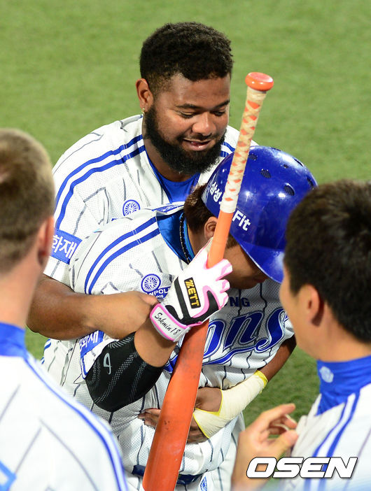 21일 오후 대구 시민구장에서 열린 삼성 라이온즈와 두산 베어스의 경기, 6회말 1사 주자 1,3루 삼성 박석민이 좌월 스리런 홈런을 날린 후 덕아웃에서 동료들에게 축하를 받던 도중 나바로에게 납치를 당해 덕아웃 안으로 끌려들어가고 있다.