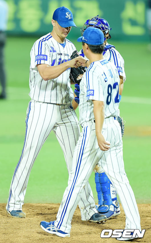 21일 오후 대구 시민구장에서 열린 삼성 라이온즈와 두산 베어스의 경기, 7회초 무사 주자 1루 두산 정수빈 타석에서 삼성 선발 마틴이 교체되고 있다.