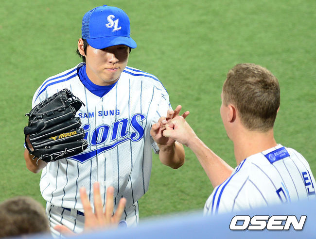 21일 오후 대구 시민구장에서 열린 삼성 라이온즈와 두산 베어스의 경기, 7회초 무사 주자 1루 두산 정수빈 타석에서 삼성 선발 마틴 대신 마운드에 오른 삼성 차우찬이 정수빈을 삼진으로 막아낸 후 마틴과 하이파이브를 하고 있다.