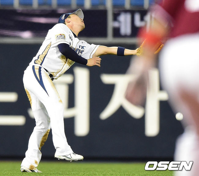 21일 오후 경남 창원 마산구장에서 열린 '2014 한국야쿠르트 세븐 프로야구' NC 다이노스와 넥센 히어로즈의 경기 7회초 무사 1루 강정호의 뜬공을 지석훈이 놓치고 있다.