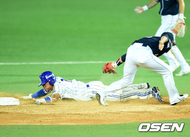 21일 오후 대구 시민구장에서 열린 삼성 라이온즈와 두산 베어스의 경기, 7회말 무사 주자 1루 삼성 나바로 타석에서 1루 주자 김상수가 2루 도루에 성공하고 있다.