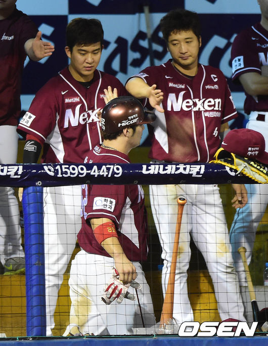 21일 오후 경남 창원 마산구장에서 열린 '2014 한국야쿠르트 세븐 프로야구' NC 다이노스와 넥센 히어로즈의 경기 7회초 1사 만루 문우람의 희생플라이에 득점한 3루주자 박병호가 덕아웃에서 동료들과 하이파이브를 하고 있다.