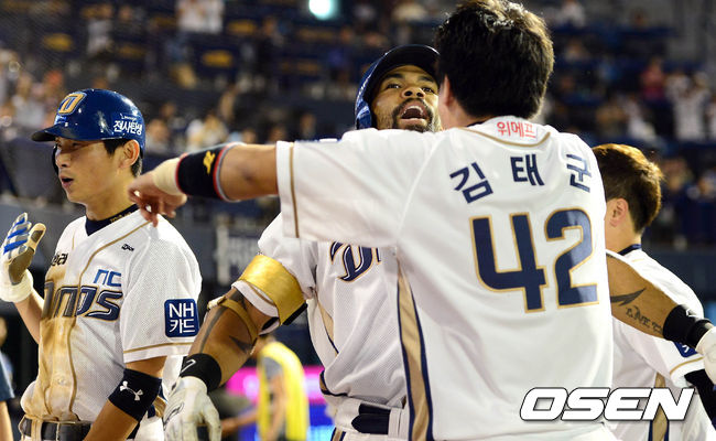 21일 오후 경남 창원 마산구장에서 열린 '2014 한국야쿠르트 세븐 프로야구' NC 다이노스와 넥센 히어로즈의 경기 7회말 2사 2루 테임즈가 투런 홈런을 치고 김태군과 세리머니를 하고 있다.