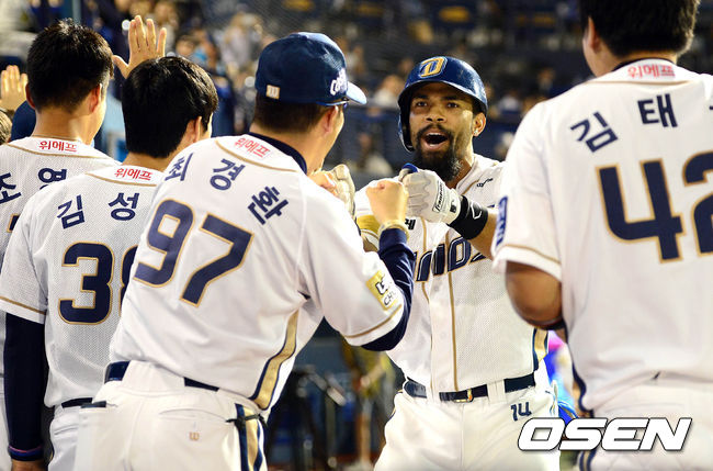 21일 오후 경남 창원 마산구장에서 열린 '2014 한국야쿠르트 세븐 프로야구' NC 다이노스와 넥센 히어로즈의 경기 7회말 2사 2루 테임즈가 투런 홈런을 치고 동료들과 하이파이브를 하고 있다.