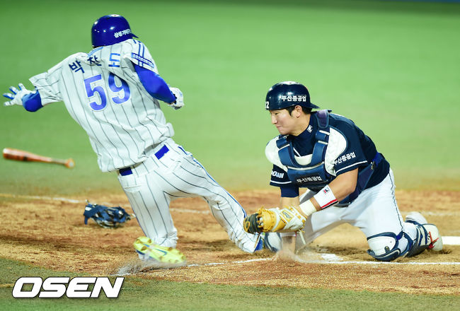 21일 오후 대구 시민구장에서 열린 삼성 라이온즈와 두산 베어스의 경기, 8회말 1사 주자 3루 삼성 박해민이 3루수 앞 번트때 3루 주자 박찬도가 홈에서 최재훈 포수에게 태그아웃을 당하고 있다.