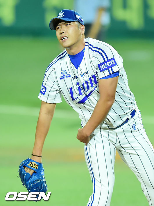 21일 오후 대구 시민구장에서 열린 삼성 라이온즈와 두산 베어스의 경기, 9회초 2사 주자 1루 두산 허경민에게 볼넷을 허용한 삼성 권혁이 아쉬워하고 있다.