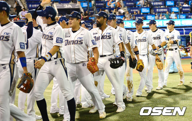 21일 오후 경남 창원 마산구장에서 열린 '2014 한국야쿠르트 세븐 프로야구' NC 다이노스와 넥센 히어로즈의 경기 종료 후 NC 선수들이 하이파이브를 하며 그라운드를 퇴장하고 있다.