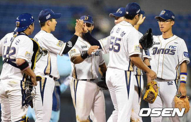 21일 오후 경남 창원 마산구장에서 열린 '2014 한국야쿠르트 세븐 프로야구' NC 다이노스와 넥센 히어로즈의 경기 종료 후 NC 선수들이 하이파이브를 하고 있다.