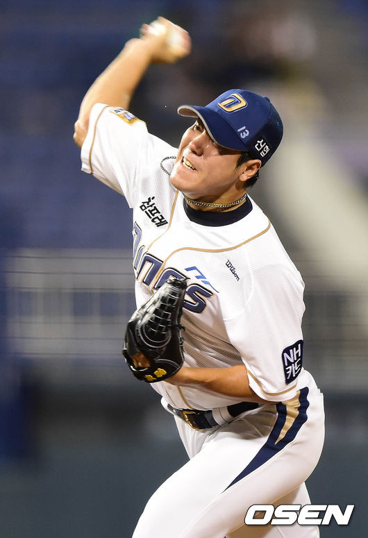 21일 오후 경남 창원 마산구장에서 열린 '2014 한국야쿠르트 세븐 프로야구' NC 다이노스와 넥센 히어로즈의 경기 9회초 김진성이 역투하고 있다.