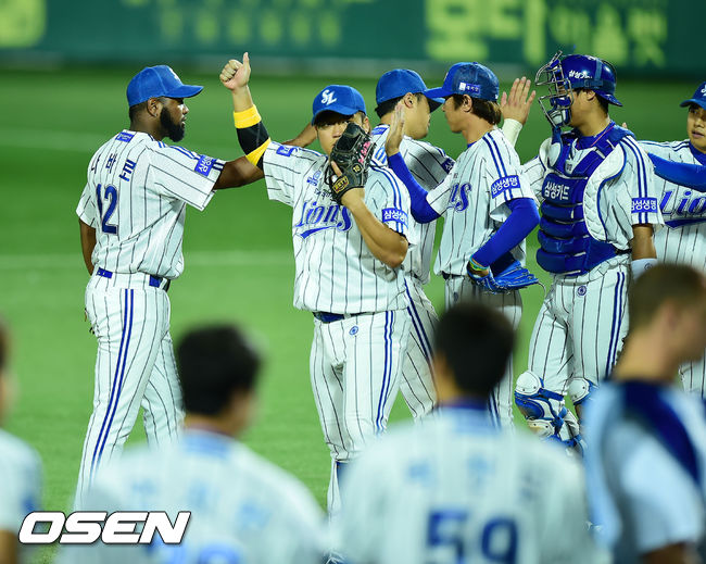 경기를 마치고 삼성 선수들이 마운드 근처에서 하이파이브를 하고 있다.. / rumi@osen.co.kr