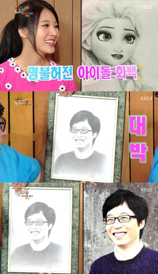 이어 유라는 유재석에게 선물이라며 직접 그린 초상화를 전달했다. 유재석은 삐뚤빼뚤한 치열마저 똑닮은 모습에 놀라워했다.