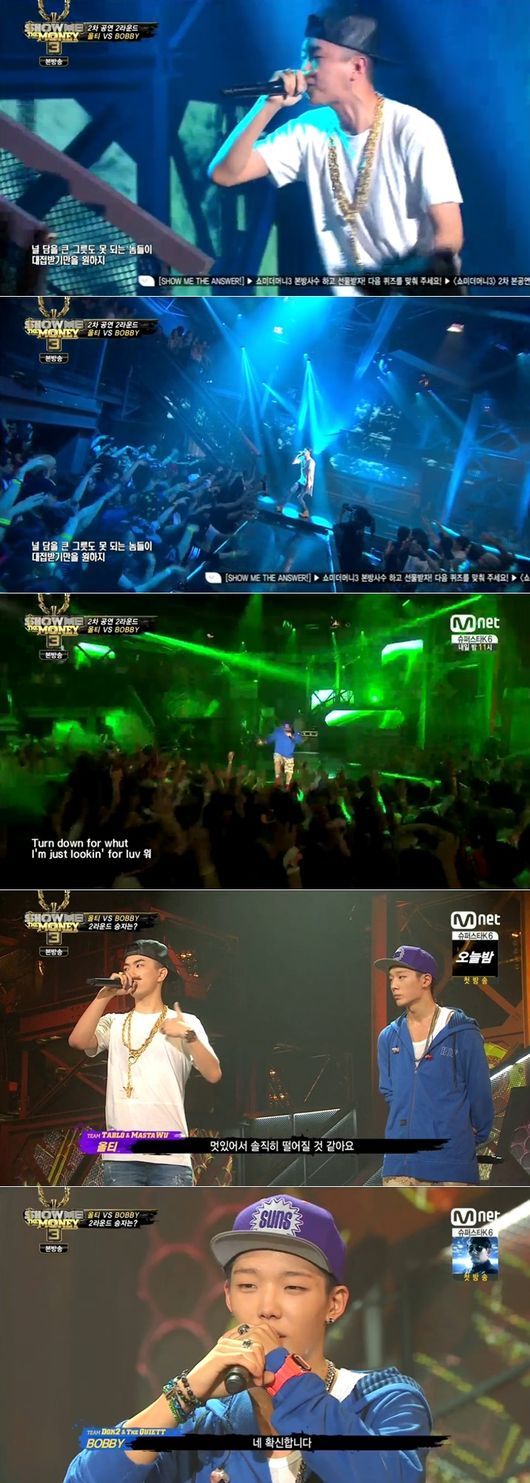 21일 오후 방송된 엠넷 서바이벌 프로그램 ‘쇼미더머니3’에는 2차 공연 2라운드 도끼-더콰이엇 팀의 바비와 타블로-마스터 우 팀의 올티의 대결이 펼쳐졌다. 하지만 끝내 결과는 공개되지 않았다.