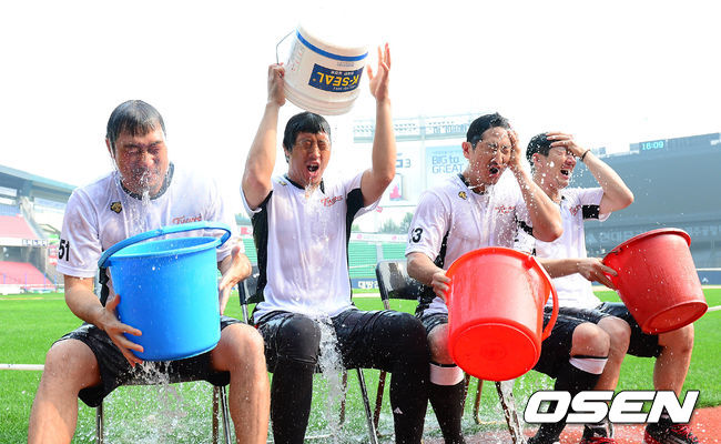 경기시작전 LG트윈스 이병규,박용택,봉중근,손주인이 아이스버킷챌린지 캠페인에 참여해 얼음물을 각자에게 붓고 있다.