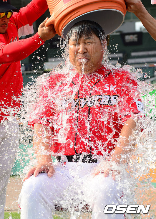 SK 이만수 감독이 아이스버킷챌린지를 진행하고 있다.