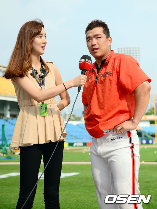 한화 정근우가 아이스버킷챌린지를 마친 후 MBC스포츠플러스 이주원 아나운서와 인터뷰를 하고 있다.